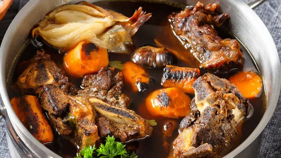 Taková kombinace umožňuje získat vývar s hlubokou, čistou a sytou chutí. V domácích podmínkách se vyplatí dodržovat tento postup a zachovat poměr 1 kg masa s kostmi na 1,5 litru studené vody . Vařit je třeba dlouho a velmi pomalu, bez silného varu.