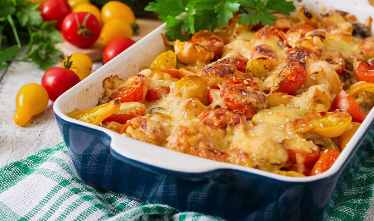 Syté ragú s kuřetem, zeleninou a žlutým sýrem. Neuvěřitelně výživné. Ideální pro večeři v jednom hrnci pro celou rodinu.