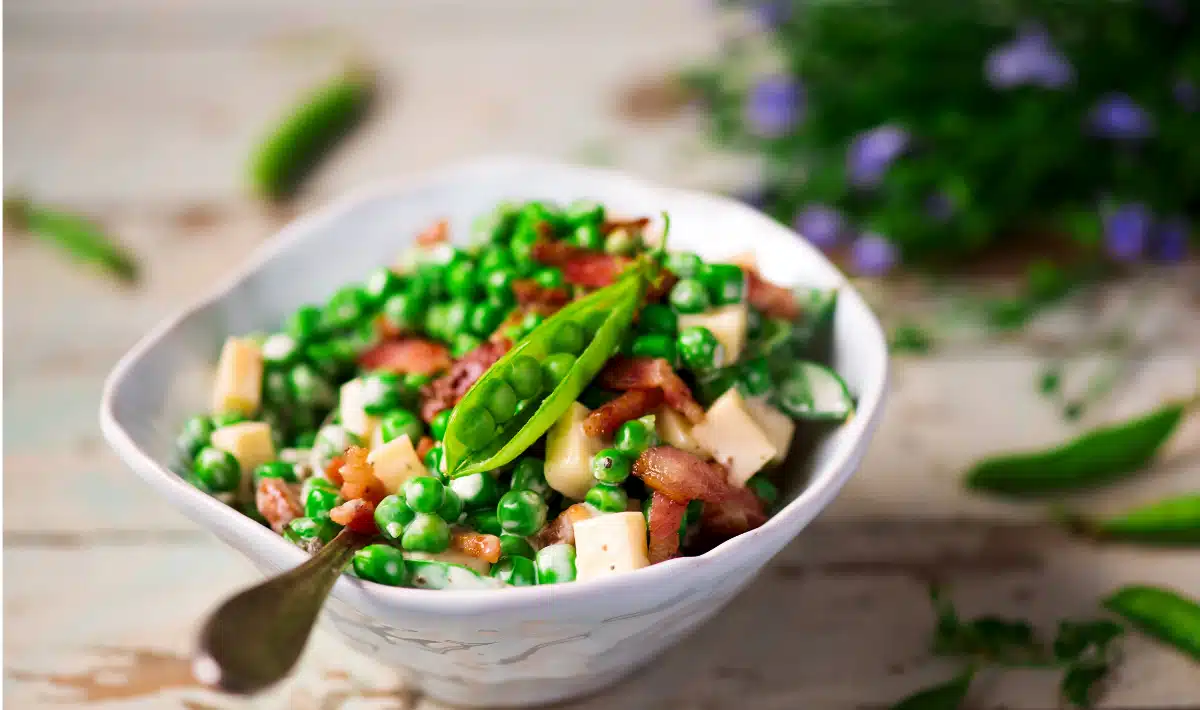 Poté posypte zbytkem hrášku a křupavým slaninou.